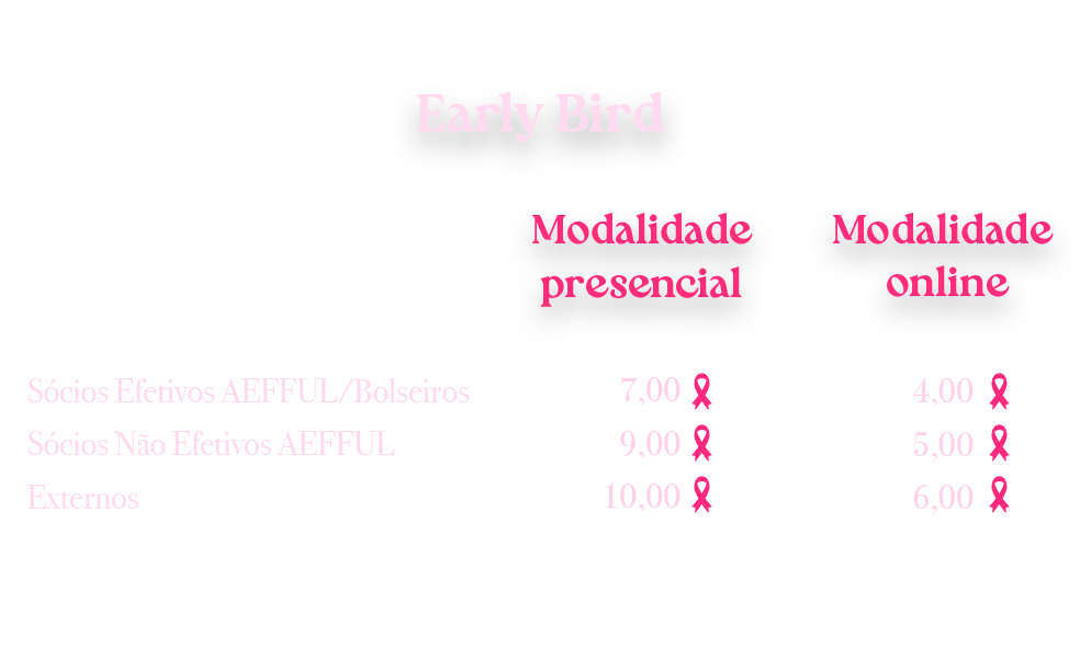 Tal como já deves saber, poderás efetuar a tua inscrição tanto em Early Bird (3/10, quinta-feira) como na Fase Normal (3/10 – 10/10, quinta-feira), mediante um formulário online. Se és bolseiro deves também apresentar o comprovativo de bolsa aquando da tua inscrição.